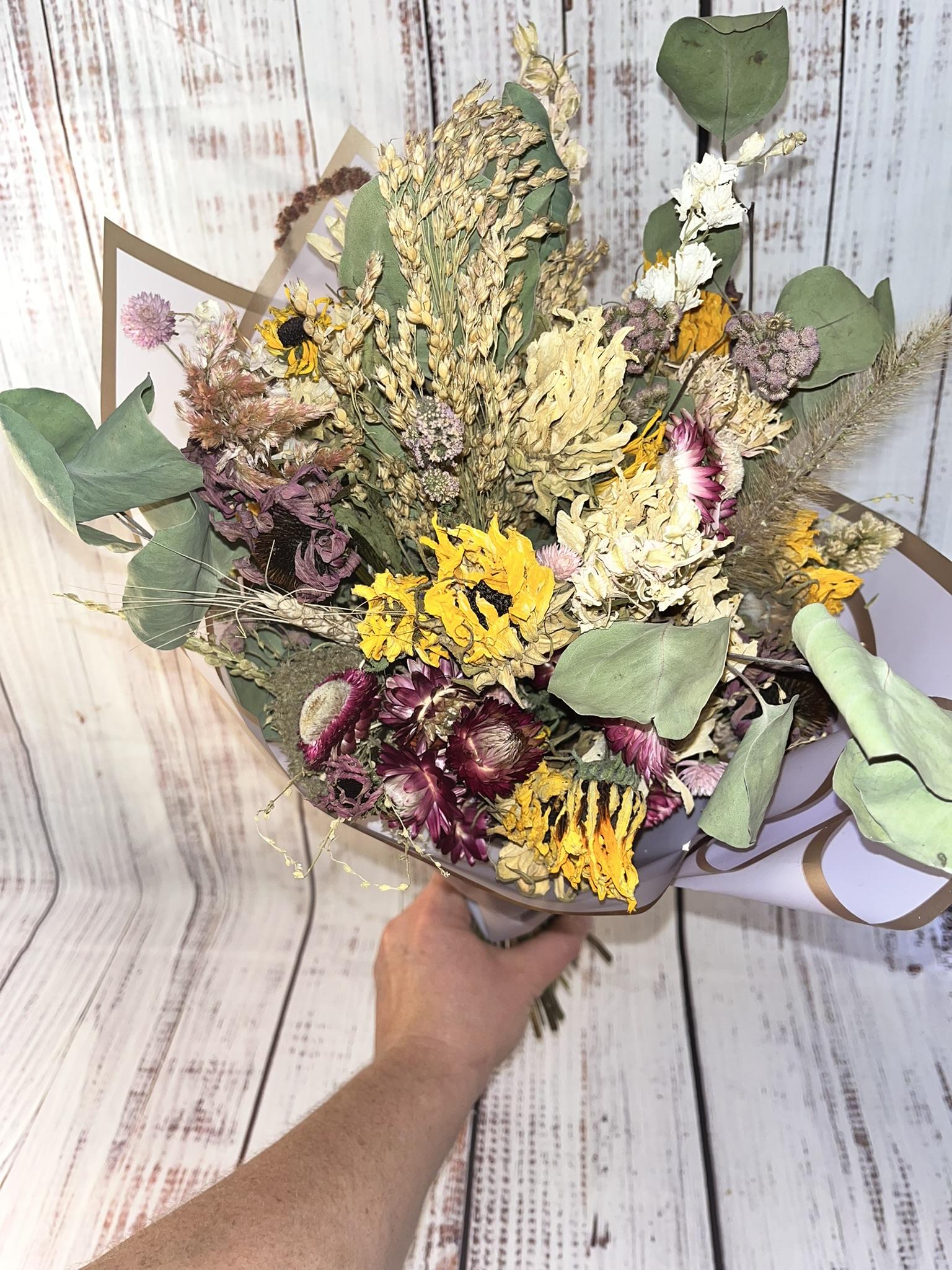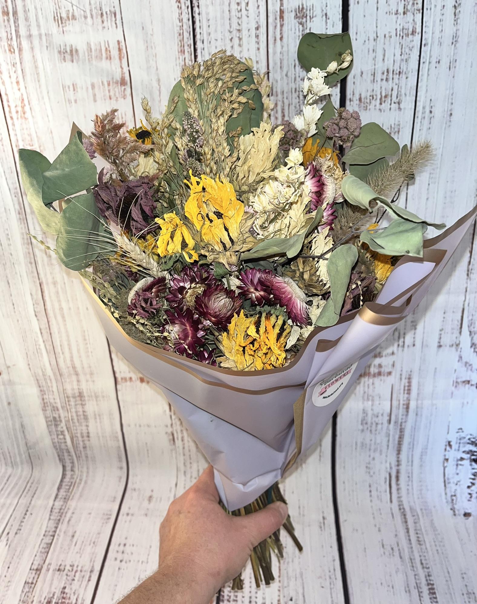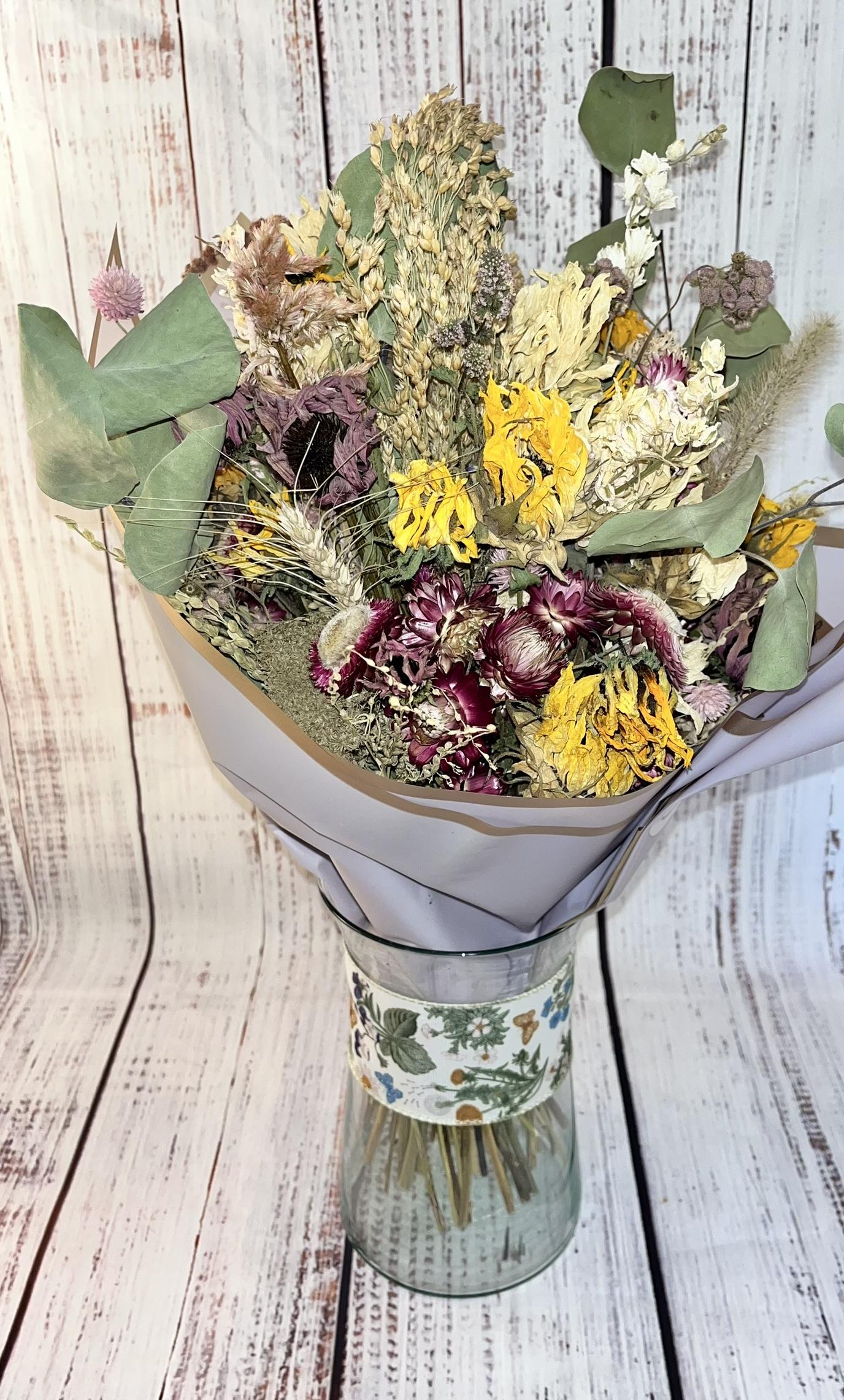 Flowers lovingly grown and harvested at The Burbstead are dried and handcrafted into an extra large Everlasting Bouquet. Wrapped in bouquet wrap and placed into a vase, then finished with a botanical ribbon. Created with a varietal mix from the fresh cut flower garden, no two are the same.