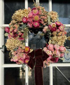 Flowers lovingly grown and harvested at The Burbstead are dried and handcrafted into an Everlasting Wreath. Created with globe amaranth, strawflowers, eucalyptus, hydrangea and more. Finished off with a hand-torn velvet ribbon in dark red.
