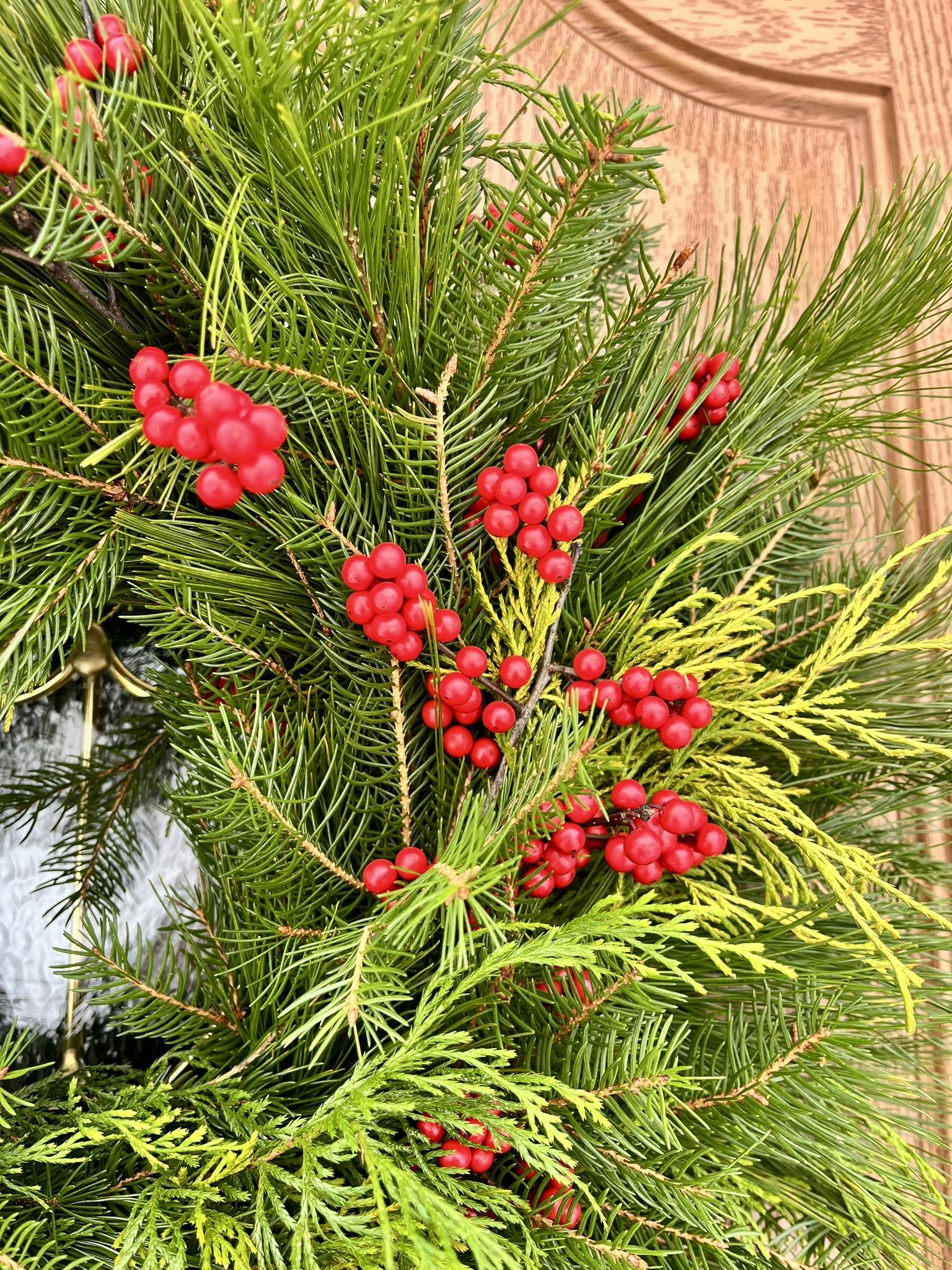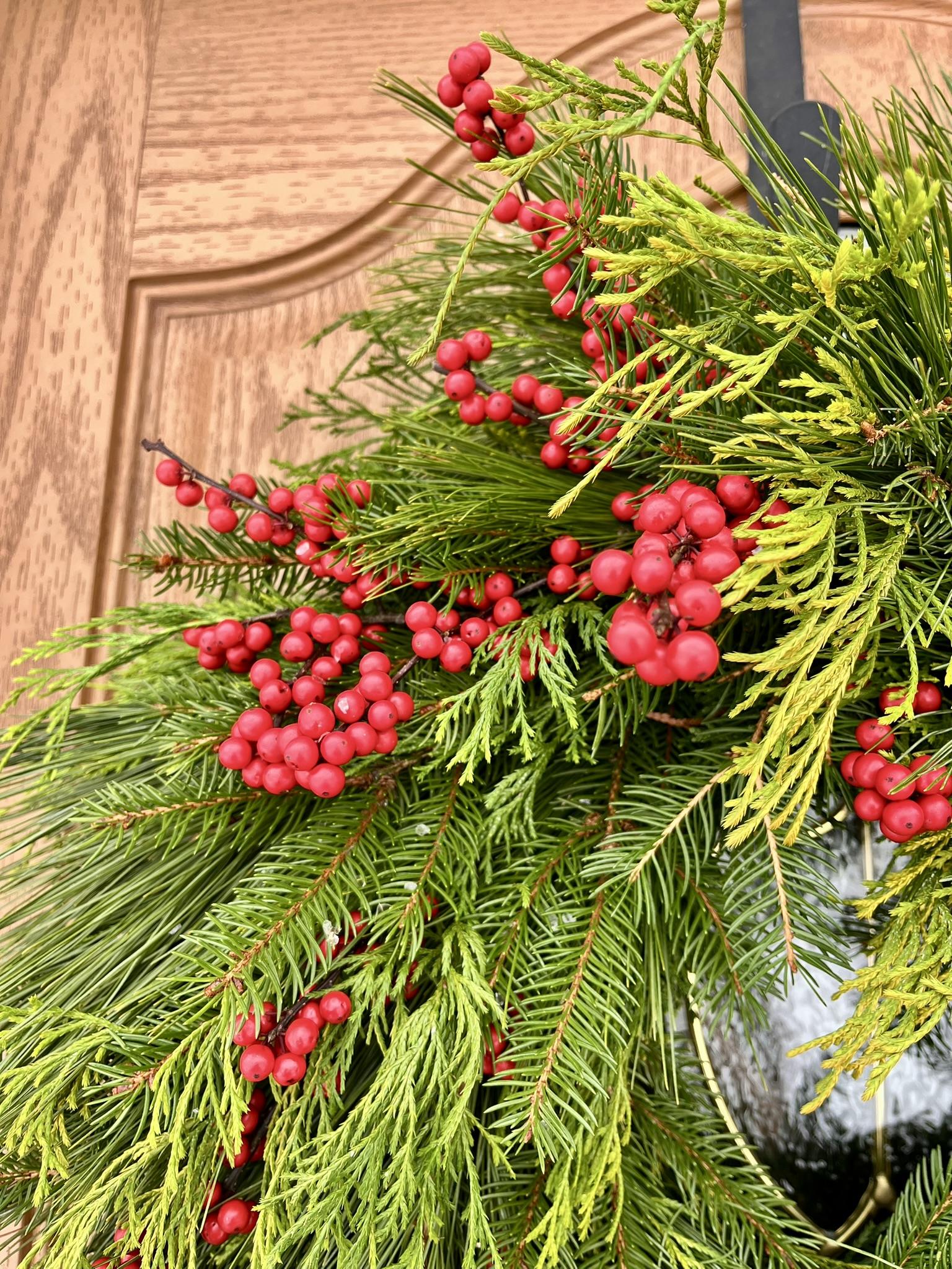 Freshly harvested evergreens are handcrafted into a fresh smelling and lush wreath, and accented with fresh winterberry holly sprigs. Greens include white pine, douglas fir, false cypress, & arborvitae. Approximately 20″ across.